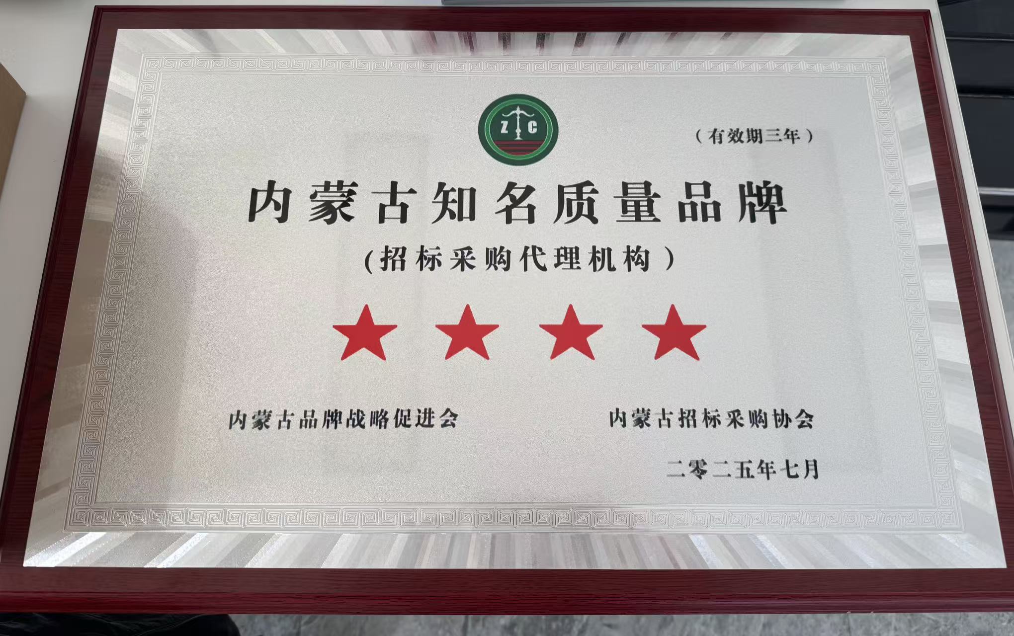 近日,经内蒙古招标采购协会与内蒙古品牌战略促进会联合认定,我司荣膺首届“内蒙古知名质量品牌(四星级)”——成为自治区招标代理机构中首批获此殊荣的企业,标志着我司在招标代理服务与品牌建设领域再获行业权威背书,成为标杆企业。