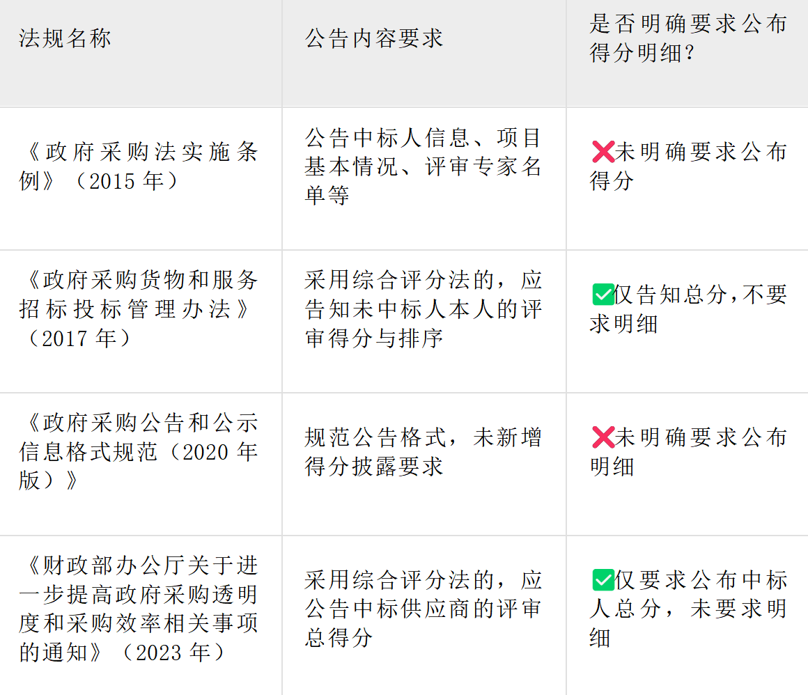 政府采购的信息公开要求逐步完善,近年来相关政策对得分公告的规定也在不断调整。以下是相关法规的对比分析: