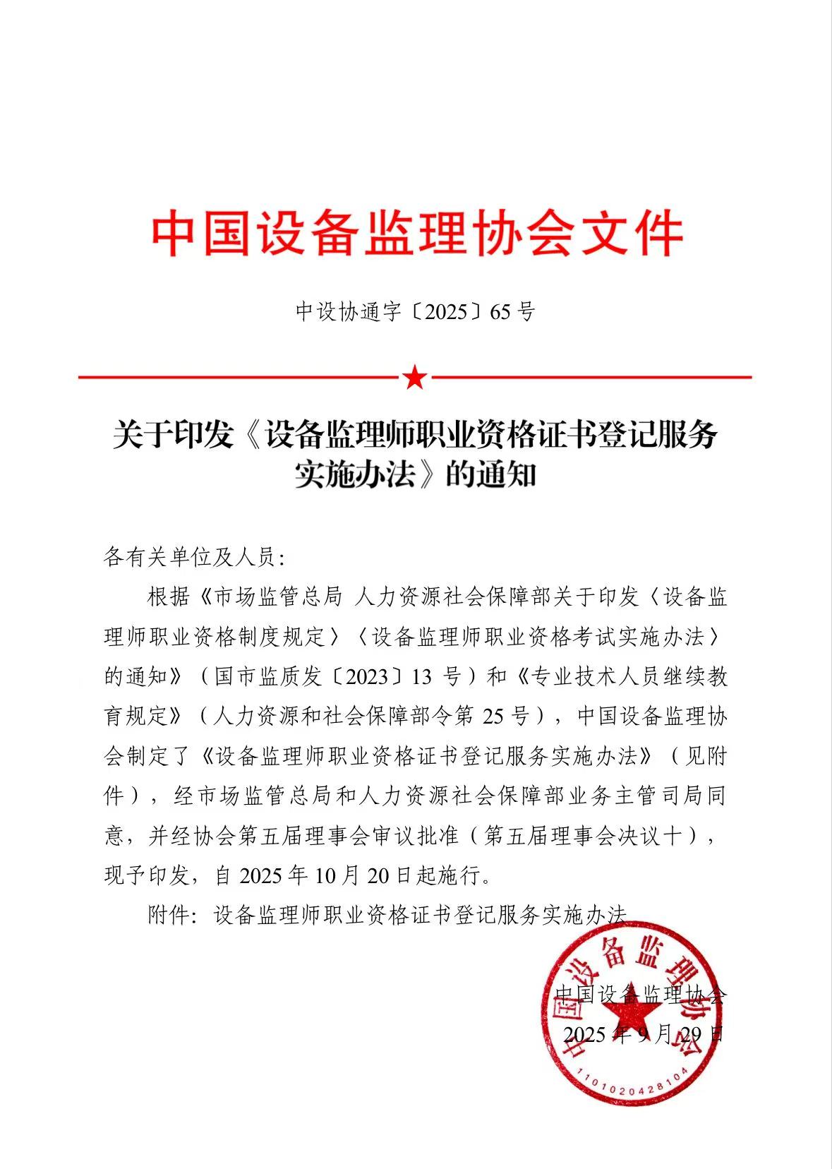 近日,中国设备监理协会发布了“关于印发《设备监理师职业资格证书登记服务实施办法》的通知”,通知指出本办法自2025年10月20日起施行。