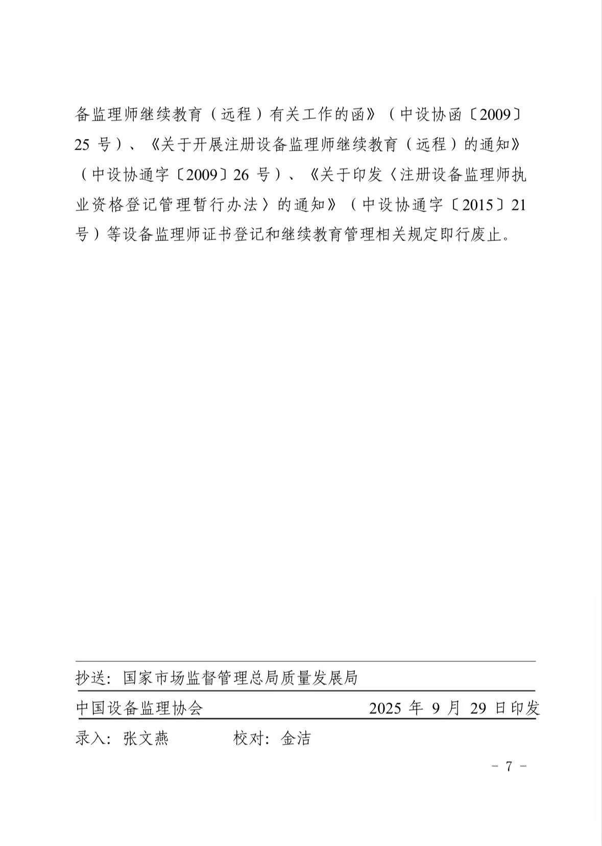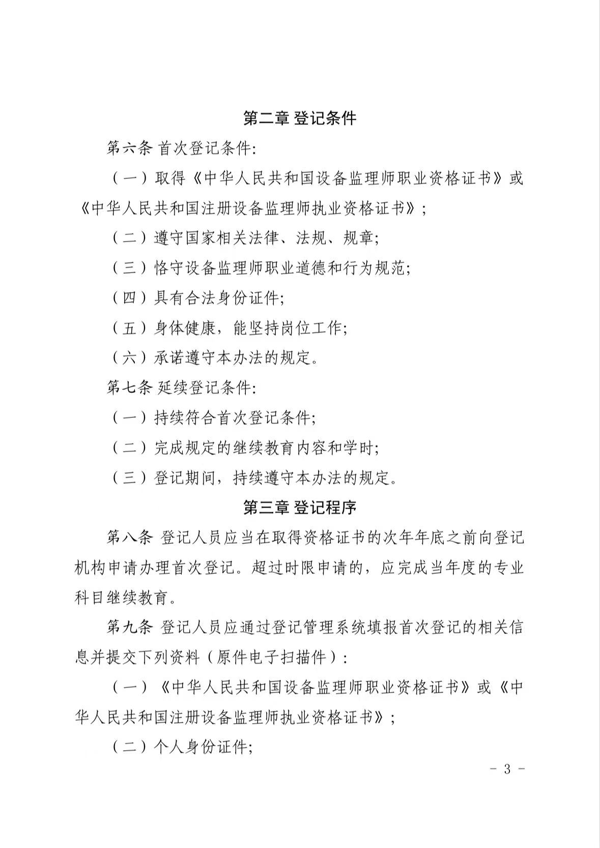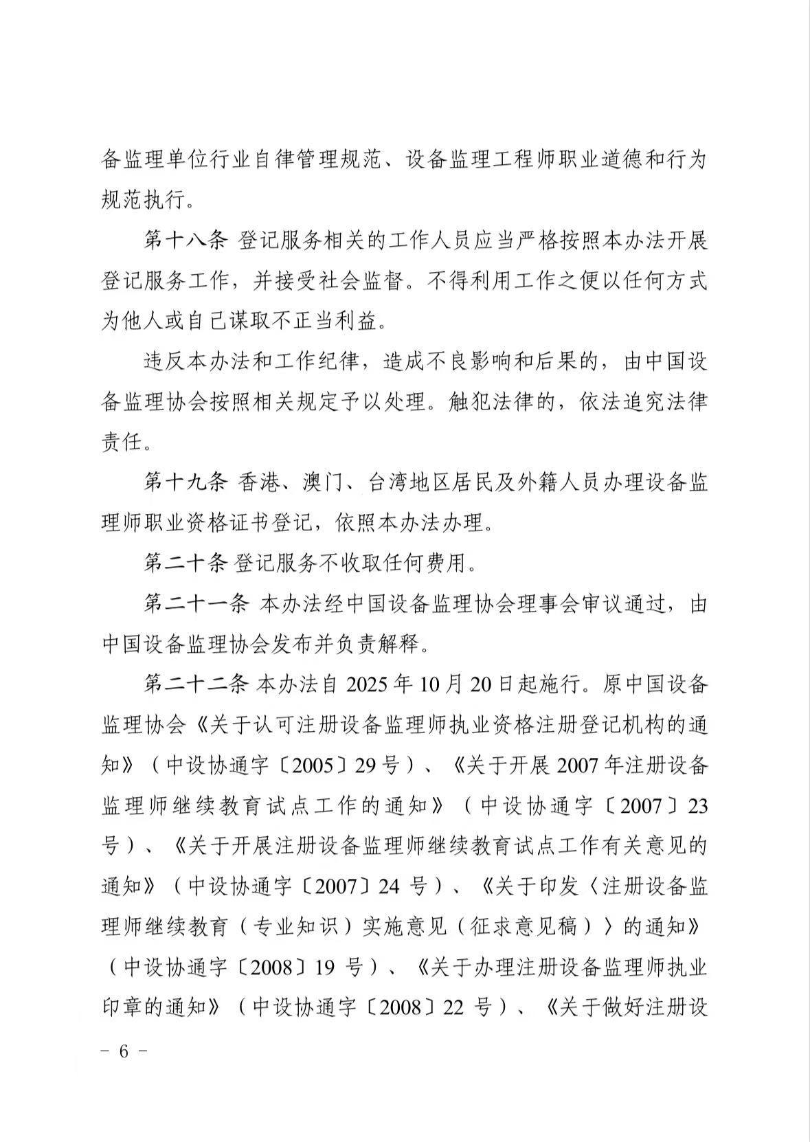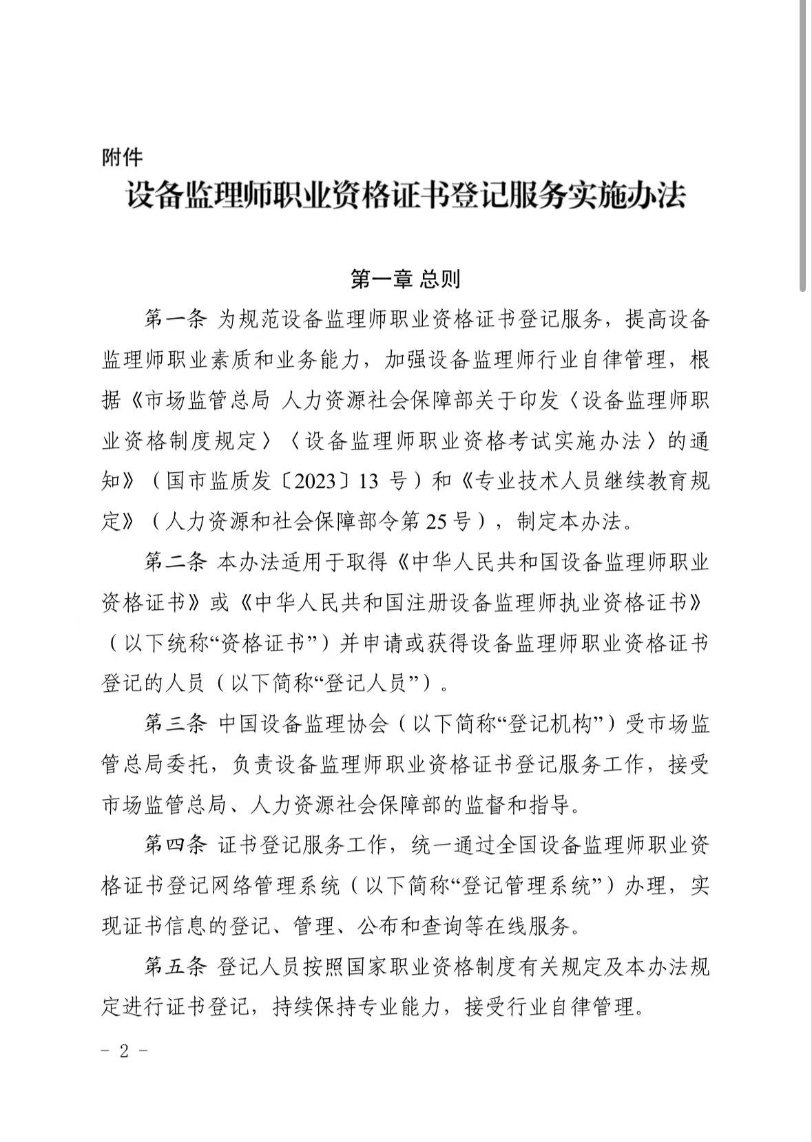 根据《市场监管总局 人力资源社会保障部关于印发〈设备监理师职业资格制度规定〉〈设备监理师职业资格考试实施办法〉的通知》(国市监质发〔2023〕13号)和《专业技术人员继续教育规定》(人力资源和社会保障部令第25号),中国设备监理协会制定了《设备监理师职业资格证书登记服务实施办法》,经市场监管总局和人力资源社会保障部业务主管司局同意,并经协会第五届理事会审议批准(第五届理事会决议十),现予印发,自2025年10月20日起施行。