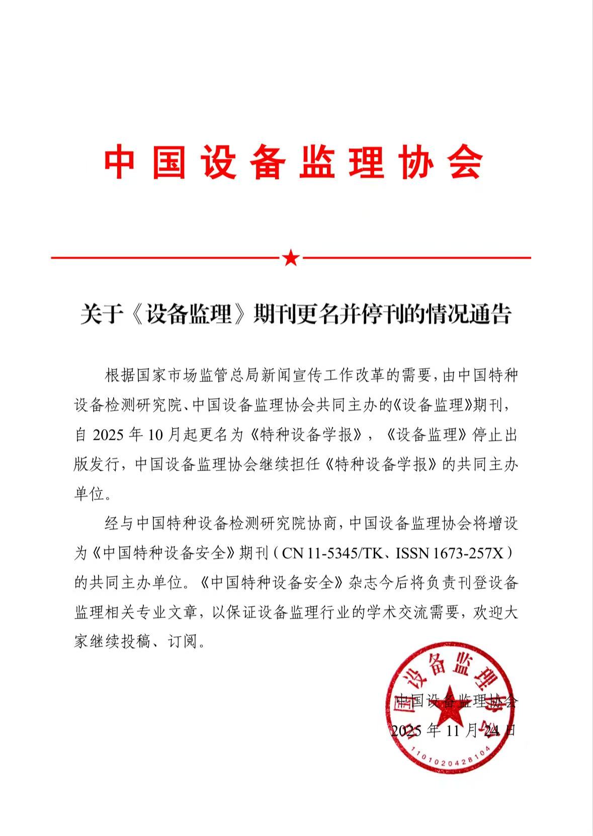 根据国家市场监管总局新闻宣传工作改革的需要,由中国特种设备检测研究院、中国设备监理协会共同主办的《设备监理》期刊,自2025年10月起更名为《特种设备学报》,《设备监理》停止出版发行,中国设备监理协会继续担任《特种设备学报》的共同主办单位。